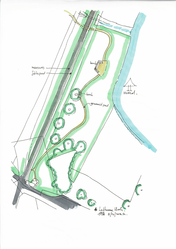 Voor de herinricting van de Lathumse Hoek, het eerste deelproject, hebben we samen met de Dorpsraad Lathum en ondernemers van de Lathumse Hoek een inrichtingsplan ontwikkeld. Om de uitloopmogelijkheden voor het dorp en de biodiversiteit te versterken. Het struinpad is eind 2023 feestelijk geopend. De verdere herinrichting is in de zomer van 2024 opgeleverd.
